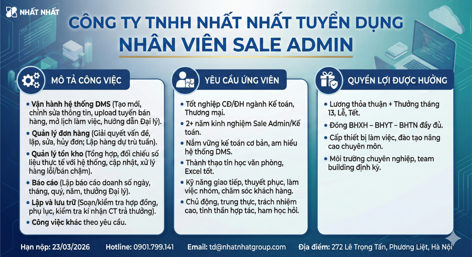 Có ít nhất 2 năm kinh nghiệm làm việc ở vị trí Sale Admin/ kế toán