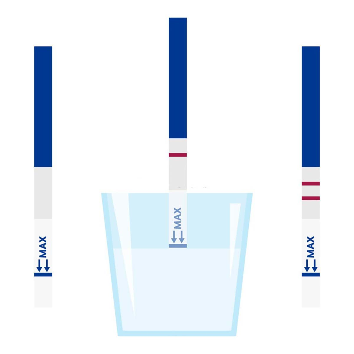 - Nhúng đầu que thử theo chiều mũi tên chỉ xuống vào cốc nước tiểu trong 10 giây (độ sâu của que không vượt quá vạch ngang đầu mũi tên in trên que thử).