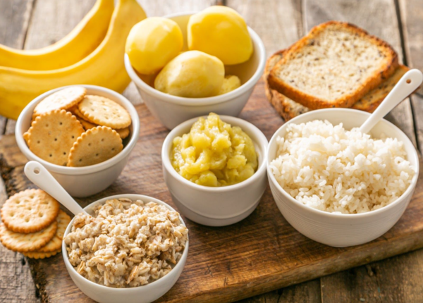 Các thực phẩm dễ tiêu hóa, ít chất xơ trong giai đoạn tiêu chảy cấp (như chuối, gạo, bánh mì nướng, sốt táo – còn gọi là chế độ ăn BRAT) có thể hữu ích.