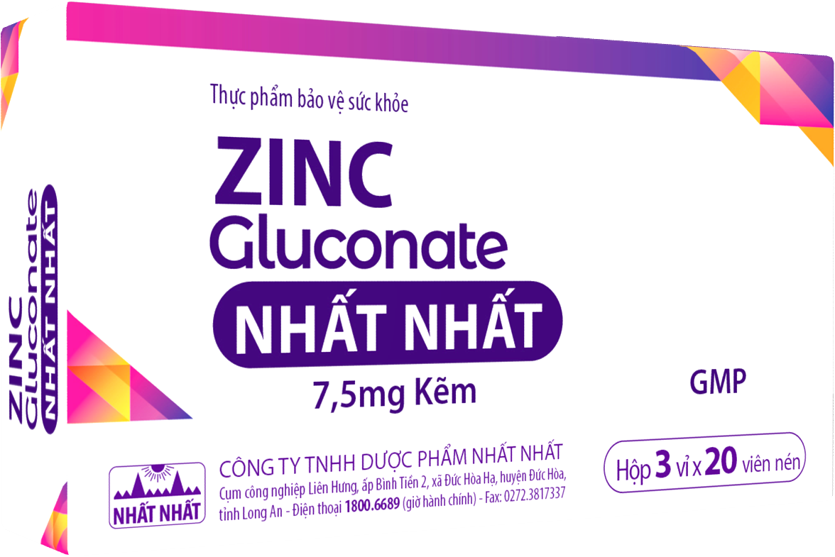 Thực phẩm bảo vệ sức khỏe ZINC GLUCONATE NHẤT NHẤT Bổ sung Kẽm Hỗ trợ tăng cường sức khỏe và sức đề kháng Thành phần (trong 1 viên nén): Kẽm gluconate 52,5 mg (tương đương với 7,5 mg kẽm). Phụ liệu: Cellulose; Lactose; Magnesium stearate; Silicon dioxide; Polyethylene glycol 6000; Hydroxypropyl methylcellulose 6cps vừa đủ 1 viên. Công dụng: Bổ sung kẽm cho cơ thể, hỗ trợ tăng cường sức khỏe và sức đề kháng, hỗ trợ tăng cường chuyển hóa. Đối tượng sử dụng: Thanh thiếu niên trong giai đoạn phát triển, phụ nữ mang thai và bà mẹ đang cho con bú cần bổ sung kẽm, người sức khỏe kém, sức đề kháng kém do thiếu kẽm. Cách dùng: Dùng đường uống với một ít nước, uống sau bữa ăn. Đối với trẻ em có thể nghiền và pha với nước. - Trẻ em từ 1-3 tuổi: ngày uống 1/2 viên. - Trẻ em từ 4-8 tuổi: 1 viên/ngày. - Người lớn và trẻ em từ 9 tuổi trở lên: 2 viên/ ngày. Quá liều và cách xử trí: - Độc tính cấp: buồn nôn, nôn mửa, sốt, suy hô hấp, hạ huyết áp. - Cách xử trí: Sử dụng chất làm dịu viêm như sữa, các chất carbonat kiềm, than hoạt tính và các chất tạo phức chelat. Cần tránh dùng các chất gây nôn hoặc rửa dạ dày. Điều kiện bảo quản: Nơi khô mát, tránh ánh nắng mặt trời. Thực phẩm này không phải là thuốc và không có tác dụng thay thế thuốc chữa bệnh, Không sử dụng cho người mẫn cảm với bất kì thành phần nào của sản phẩm. Thương nhân sản xuất và chịu trách nhiệm về chất lượng sản phẩm: Công ty TNHH Dược phẩm Nhất Nhất Điện thoại liên hệ: 1800.6689 Thực phẩm này không phải là thuốc và không có tác dụng thay thế thuốc chữa bệnh |