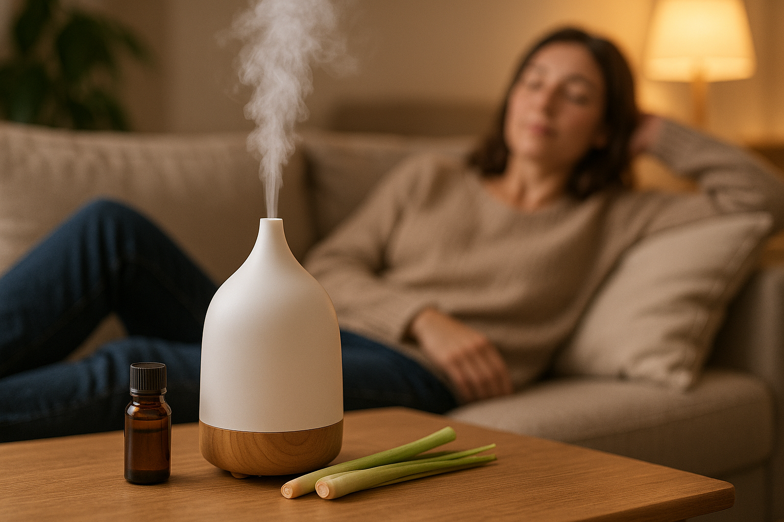 Hương thơm thanh mát, nhẹ nhàng của sả chanh có tác động tích cực đến hệ thần kinh. Khi khuếch tán trong không khí, mùi hương này giúp làm dịu tâm trí, xua tan cảm giác mệt mỏi, lo âu, và mang lại một không gian sống thư thái, dễ chịu sau một ngày làm việc căng thẳng.