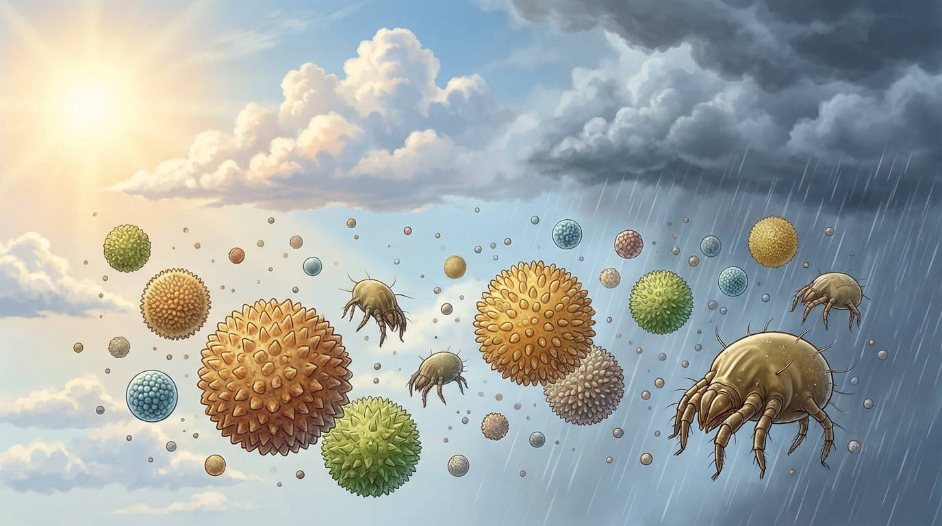 Sự thay đổi của thời tiết không chỉ tác động trực tiếp mà còn gián tiếp làm gia tăng các yếu tố gây dị ứng trong môi trường. Mùa xuân, với sự đâm chồi nảy lộc của thực vật, mang theo nồng độ phấn hoa cao trong không khí. Mùa mưa hoặc những ngày nồm ẩm lại là điều kiện lý tưởng cho nấm mốc sinh sôi và phát triển ở những nơi ẩm thấp trong nhà. Gió có thể phát tán những dị nguyên siêu nhỏ này đi rất xa, khiến chúng dễ dàng xâm nhập vào đường thở khi chúng ta hít thở.